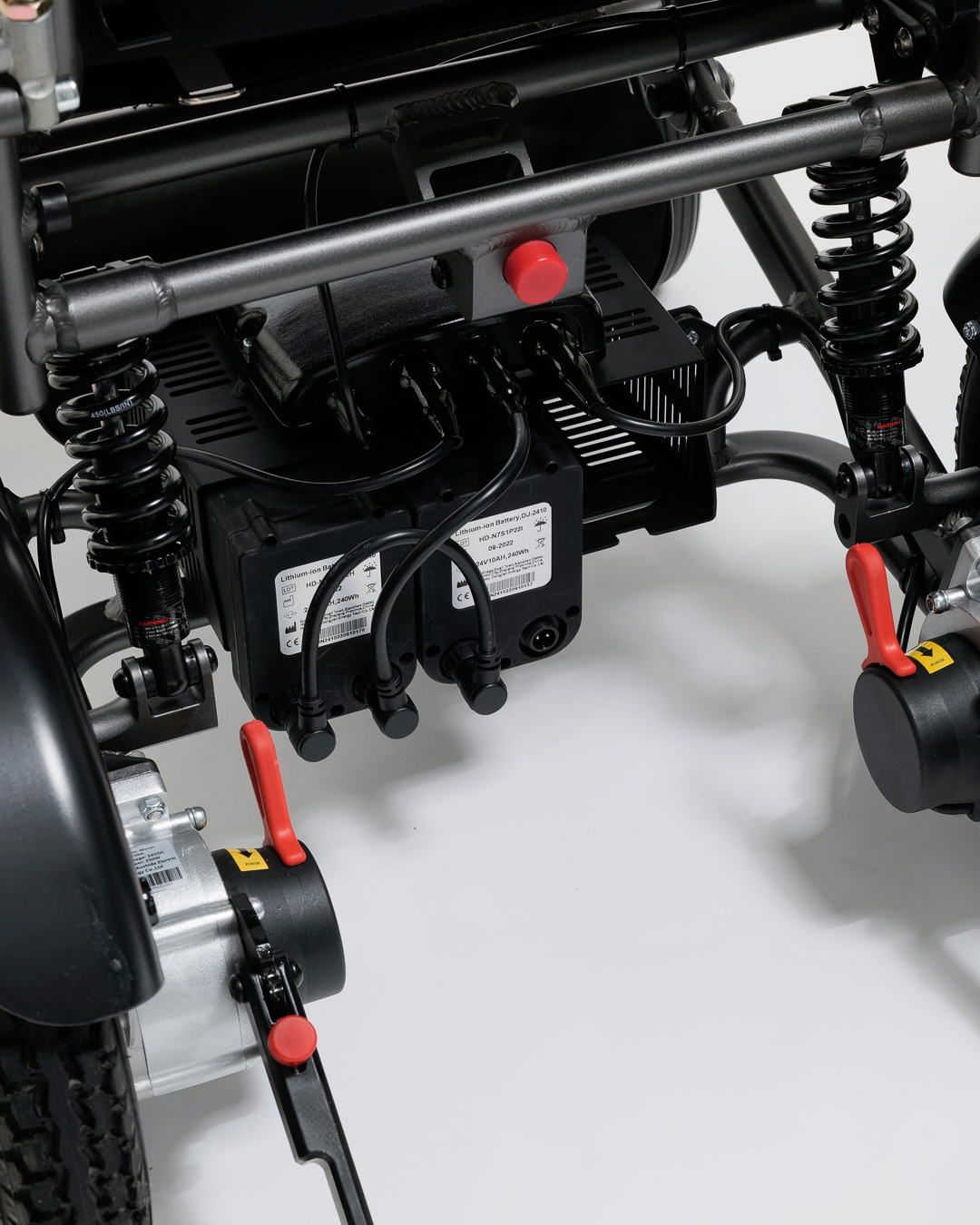 With suspension on all four wheels and efficient damping on the rear wheels, this chair ensures a smooth and comfortable ride. The ride quality is further improved by the specially designed rigid and sturdy chassis.