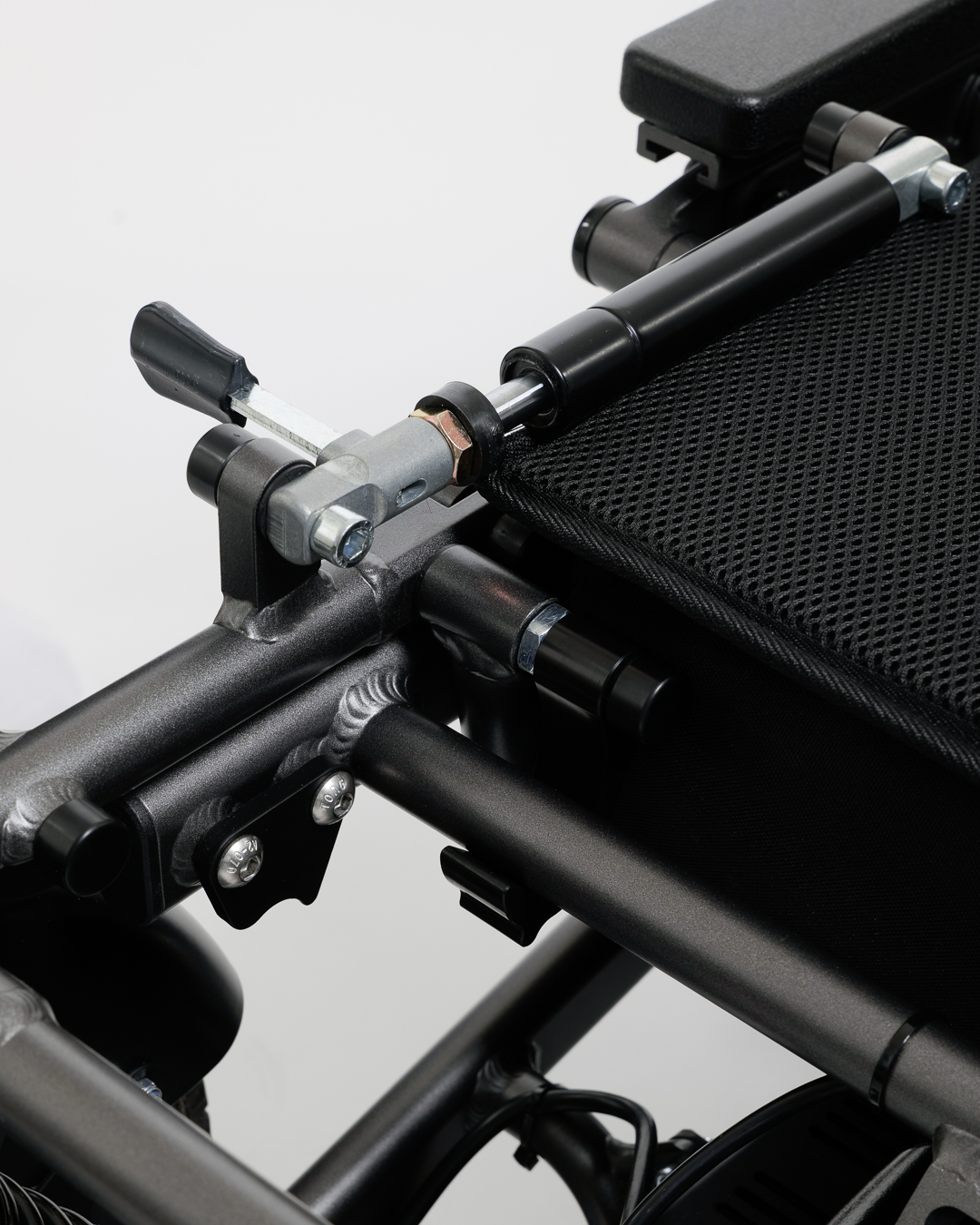 Adjustable armrests and footrest allow for a more tailored fit and further adds to its comfort focus. Equipped with three battery slots, this model offers extended usage for longer journeys. When folded, a convenient saftey clip keeps the wheelchair locked in compact position for easy transport and storage.